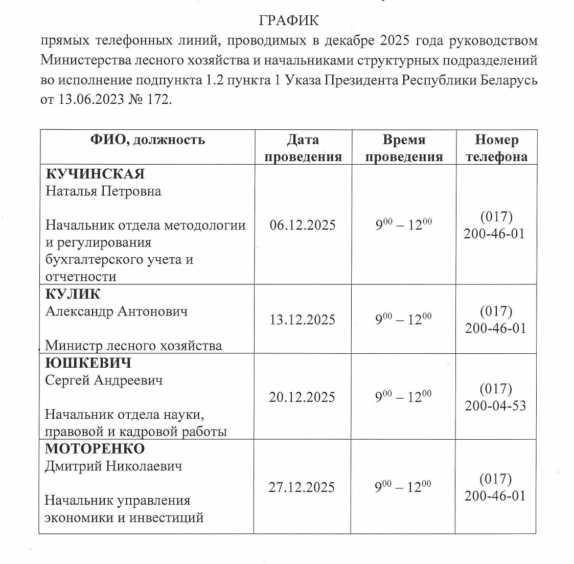 График прямых телефонных линий в декабре